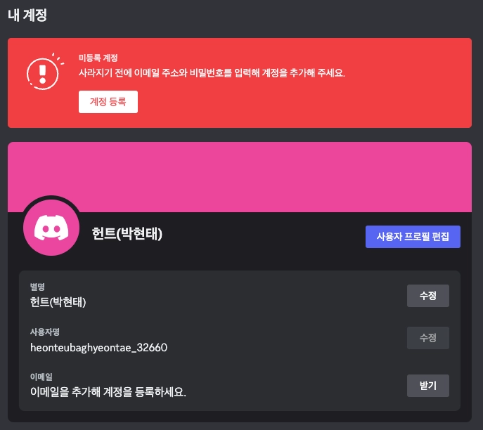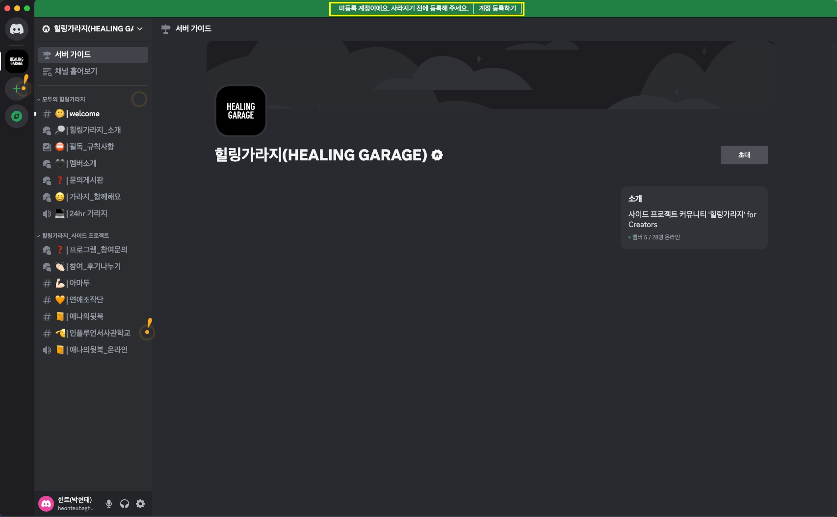만약 채널 입장 후 상단에 미등록 계정으로 뜰 경우, 계정 등록을 해주시면 됩니다